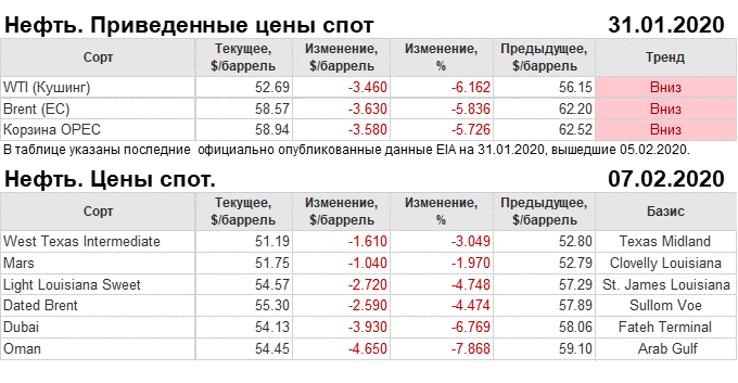 Цены спот на нефть по сортам и базисам. Данные на 07.02.2020