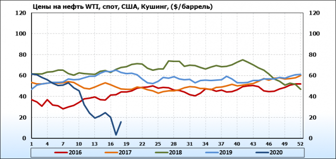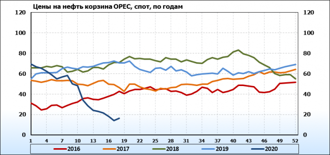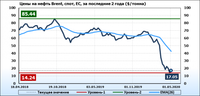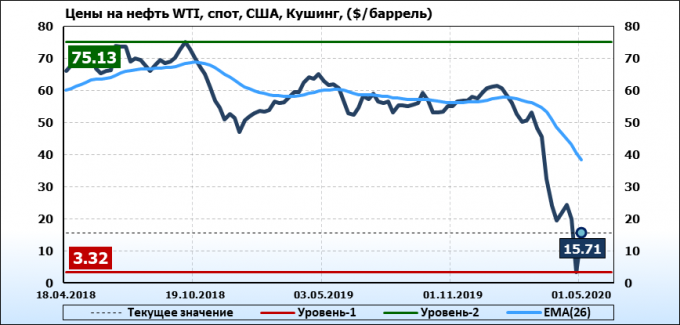 Цены на нефть сорта WTI с базиса поставки Кушинг выросли на 12.39 до 15.71 долларов за баррель. Тренд на рынке WTI медвежий. Цены на нефть сорта Brent с поставкой из портов ЕС выросли на 2.81 до 17.05 долларов за баррель. Тренд на рынке Brent падающий. Цены на корзину сортов нефти стран членов ОПЕК выросли на 2.21 до 16.52 долларов за баррель. Ценовая тенденция по корзине ОПЕК направлена вниз. Цена на сорт MARS выросла на 7.09 до 25.95 долларов за баррель. Цена на сорт Oman выросла на 11.74 до 30.2 долларов за баррель. Сорт марки Dubai подорожал на 4.98 до 27.35 долларов за баррель.