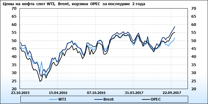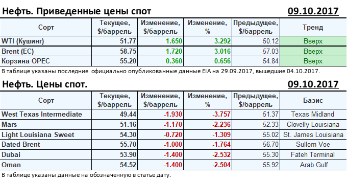 Цены спот на нефть по сортам и базисам. Данные на 09.10.2017