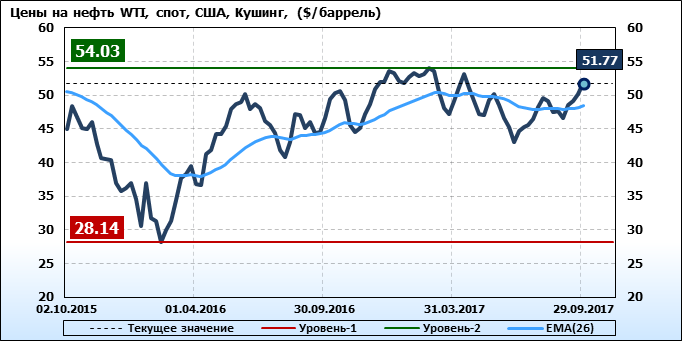Цены на нефть сорта WTI с базиса поставки Кушинг выросли на 1.65 до 51.77 долларов за баррель. Тренд на рынке WTI бычий. Цена на сорт MARS упала на -1.17 до 51.16 долларов за баррель.