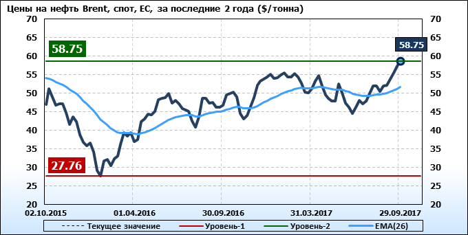 Цены на нефть сорта Brent с поставкой из портов ЕС выросли на 1.72 до 58.75 долларов за баррель. Тренд на рынке Brent растущий.