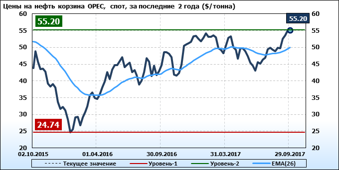 Цены на корзину сортов нефти стран членов ОПЕК выросли на 0.36 до 55.2 долларов за баррель. Ценовая тенденция по корзине ОПЕК направлена вверх. Сорт марки Dubai подешевел на -1.4 до 53.9 долларов за баррель.