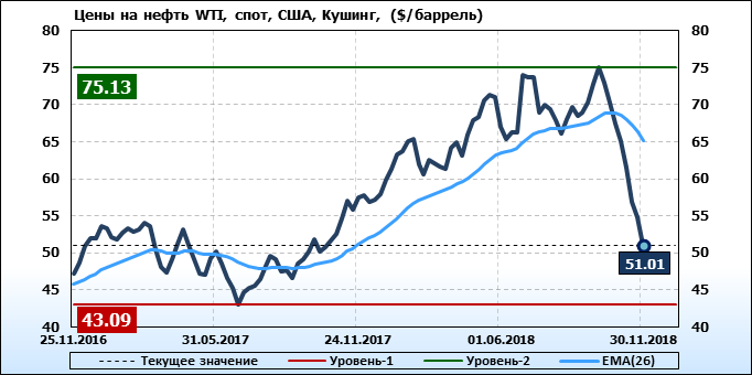 Цены на нефть сорта WTI с базиса поставки Кушинг упали на -3.74 до 51.01 долларов за баррель. Тренд на рынке WTI медвежий. Цены на нефть сорта Brent с поставкой из портов ЕС упали на -2.57 до 58.65 долларов за баррель. Тренд на рынке Brent падающий. Цены на корзину сортов нефти стран членов ОПЕК упали на -1.94 до 58.33 долларов за баррель. Ценовая тенденция по корзине ОПЕК направлена вниз. Цена на сорт MARS выросла на 0.28 до 54.3 долларов за баррель. Цена на сорт Oman выросла на 0.06 до 58.76 долларов за баррель. Сорт марки Dubai подешевел на -0.88 до 65.59 долларов за баррель.