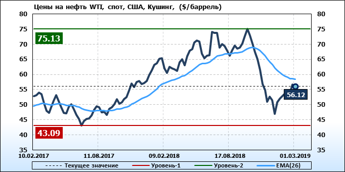 Цены на нефть сорта WTI с базиса поставки Кушинг упали на 0.62 до 56.12 долларов за баррель. Тренд на рынке WTI медвежий.