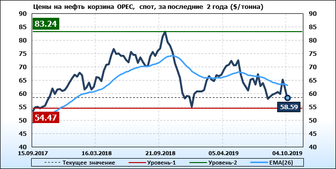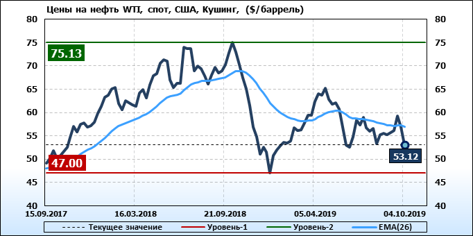 Цены на нефть сорта WTI с базиса поставки Кушинг упали на -3.78 до 53.12 долларов за баррель. Тренд на рынке WTI медвежий. Цены на нефть сорта Brent с поставкой из портов ЕС упали на -3.93 до 59.22 долларов за баррель. Тренд на рынке Brent падающий. Цены на корзину сортов нефти стран членов ОПЕК упали на -3.92 до 58.59 долларов за баррель. Ценовая тенденция по корзине ОПЕК направлена вниз. Цена на сорт MARS выросла на 1.3 до 54.05 долларов за баррель. Цена на сорт Oman выросла на 1.43 до 59.42 долларов за баррель. Сорт марки Dubai подешевел на -4.65 до 56.47 долларов за баррель.