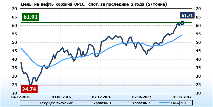 Цены на корзину сортов нефти стран членов ОПЕК выросли на 0.07 до 61.71 доллара за баррель. Ценовая тенденция по корзине ОПЕК направлена вверх. Сорт марки Dubai подешевел на -0.4 до 60.8 долларов за баррель.