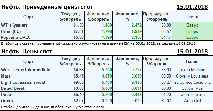 Цены спот на нефть по сортам и базисам. Данные на 15.01.2018