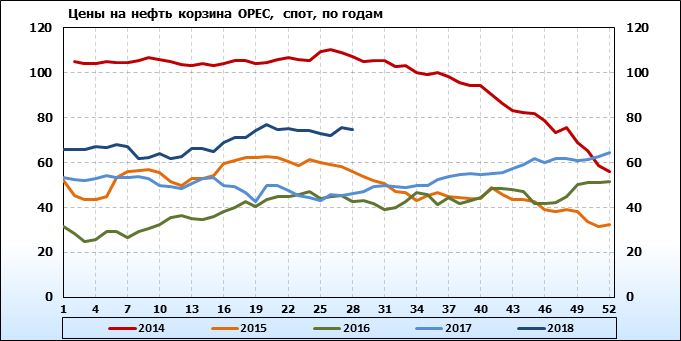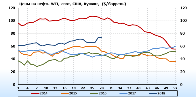 «Предполагаемая средняя цена за баррель нефти была $52,81 в 2017 году, предполагаемая цена, основанная на рыночных фьючерсах (на 1 июля 2018 года) $70,23 за баррель в 2018 году и $68,99 за баррель в 2019 году», — заявили в МВФ.