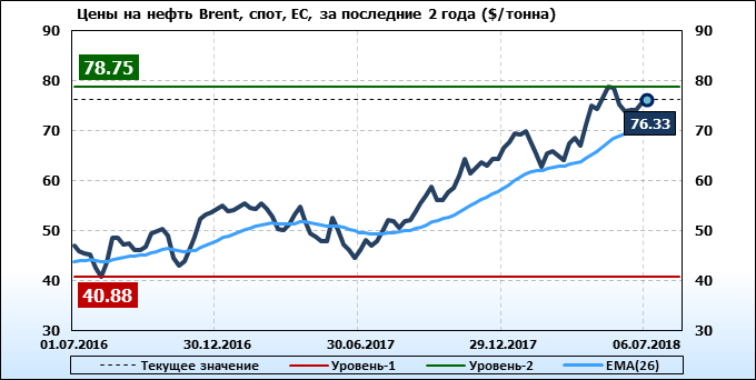 Цены на нефть сорта Brent с поставкой из портов ЕС выросли на 1.09 до 76.33 долларов за баррель. Тренд на рынке Brent растущий.