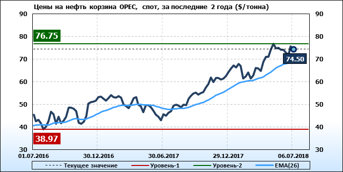 Цены на корзину сортов нефти стран членов ОПЕК упали на -1.19 до 74.5 долларов за баррель. Ценовая тенденция по корзине ОПЕК направлена вверх.