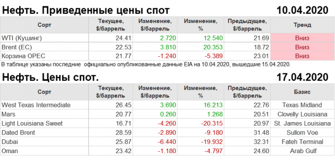 Цены спот на нефть по сортам и базисам. Данные на 17.04.2020