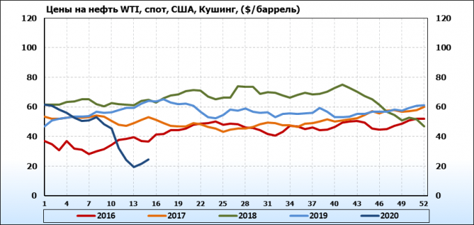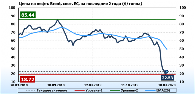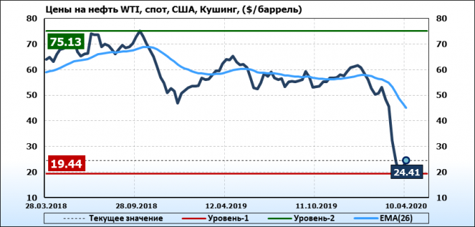 Майские фьючерсы на WTI дешевели на электронных торгах Нью-йоркской товарной биржи (NYMEX) к этому времени на $0,18 (0,91%) — до $19,69 за баррель. По итогам предыдущих торгов WTI осталась минимальном уровне с 7 февраля 2002 года.
