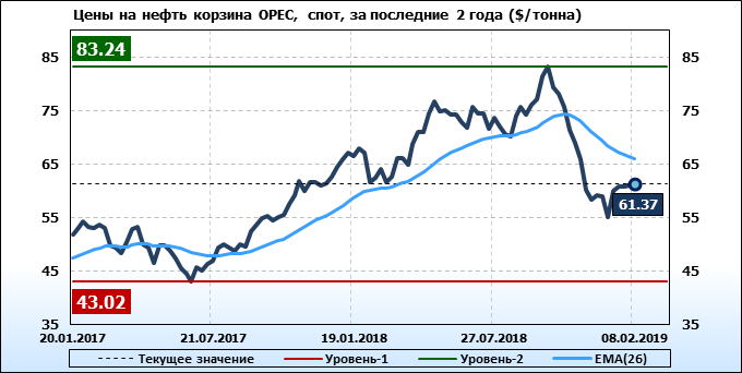 Цены на корзину сортов нефти стран членов ОПЕК выросли на 0.44 до 61.37 долларов за баррель. Ценовая тенденция по корзине ОПЕК направлена вниз.