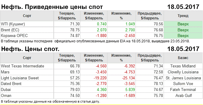 Цены спот на нефть по сортам и базисам. Данные на 18.05.2017