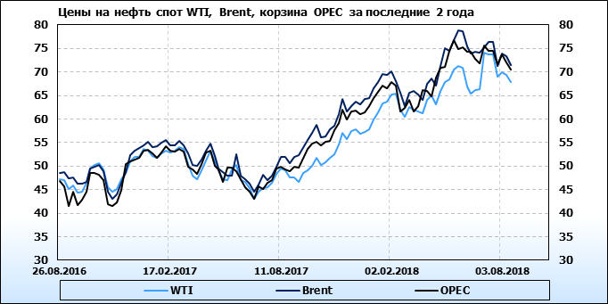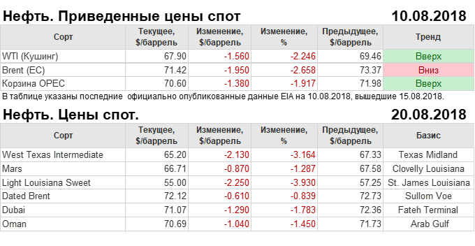 Цены спот на нефть по сортам и базисам. Данные на 20.08.2018