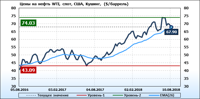 Цены на нефть сорта WTI с базиса поставки Кушинг упали на -1.56 до 67.9 долларов за баррель. Тренд на рынке WTI бычий.