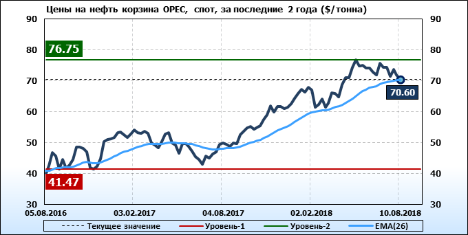Цены на корзину сортов нефти стран членов ОПЕК упали на -1.38 до 70.6 долларов за баррель. Ценовая тенденция по корзине ОПЕК направлена вверх.