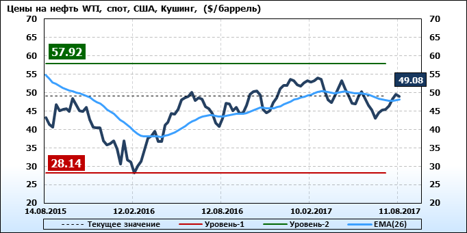 Цены на нефть сорта WTI с базиса поставки Кушинг упали на -0.44 до 49.08 долларов за баррель. Тренд на рынке WTI бычий. Цена на сорт MARS выросла на 0.09 до 48.14 долларов за баррель.