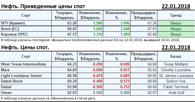 Цены спот на нефть по сортам и базисам. Данные на 22.01.2018