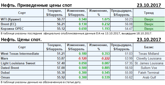 Цены спот на нефть по сортам и базисам. Данные на 23.10.2017