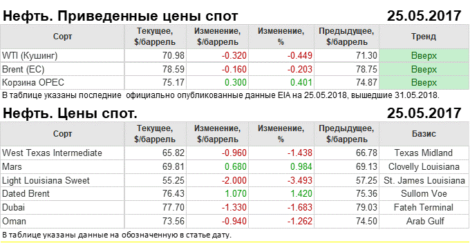 Цены спот на нефть по сортам и базисам. Данные на 25.05.2017
