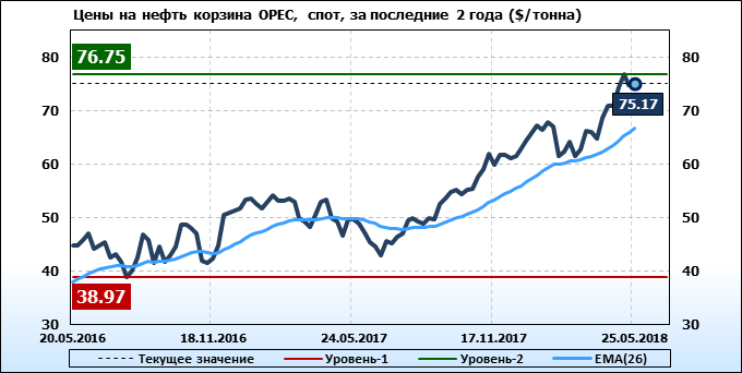 Цены на корзину сортов нефти стран членов ОПЕК выросли на 0.3 до 75.17 долларов за баррель. Ценовая тенденция по корзине ОПЕК направлена вверх.