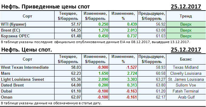 Цены спот на нефть по сортам и базисам. Данные на 25.12.2017