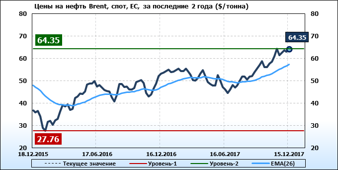 Цены на нефть сорта Brent с поставкой из портов ЕС выросли на 1.27 до 64.35 долларов за баррель. Тренд на рынке Brent растущий.