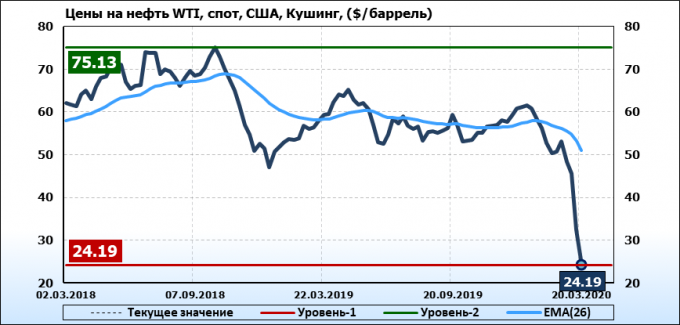 Стоимость барреля нефти марки WTI с поставкой в мае 2020 года в ходе торгов азиатской сессии выросла на 1,4%. В ходе предыдущих торгов, 26 марта, цены падали на 7,5%, достигая в минимуме $22,6. Цены на фьючерсы WTI торгуются на уровне $23 — $24 четвертый день подряд, сейчас они колеблются между $22,7 и $23,4. Биржа работает круглосуточно, в режиме удаленного доступа.