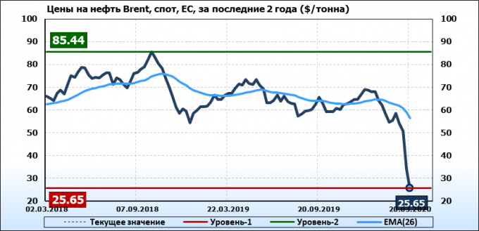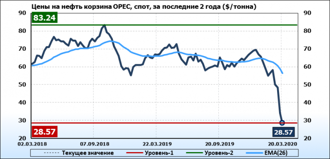 Цены на нефть сорта WTI с базиса поставки Кушинг упали на -8.2 до 24.19 долларов за баррель. Тренд на рынке WTI медвежий. Цены на нефть сорта Brent с поставкой из портов ЕС упали на -8.45 до 25.65 долларов за баррель. Тренд на рынке Brent падающий. Цены на корзину сортов нефти стран членов ОПЕК упали на -5.56 до 28.57 долларов за баррель. Ценовая тенденция по корзине ОПЕК направлена вниз. Цена на сорт MARS упала на -2.72 до 18.95 долларов за баррель. Цена на сорт Oman упала на -1.8 до 28.3 долларов за баррель. Сорт марки Dubai подорожал на 2.17 до 29.26 долларов за баррель.