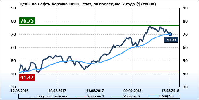 Цены на корзину сортов нефти стран членов ОПЕК упали на -0.33 до 70.27 долларов за баррель. Ценовая тенденция по корзине ОПЕК направлена вниз.