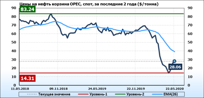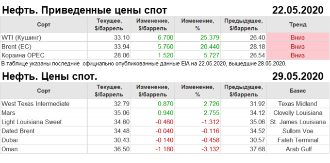 Цены спот на нефть по сортам и базисам. Данные на 29.05.2020