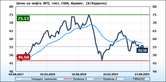 Цены на нефть сорта WTI с базиса поставки Кушинг выросли на 0.19 до 55.5 долларов за баррель. Тренд на рынке WTI медвежий. Цены на нефть сорта Brent с поставкой из портов ЕС выросли на 1.32 до 59.57 долларов за баррель. Тренд на рынке Brent падающий. Цены на корзину сортов нефти стран членов ОПЕК выросли на 0.64 до 59.67 долларов за баррель. Ценовая тенденция по корзине ОПЕК направлена вниз. Цена на сорт MARS выросла на 1.46 до 57.41 долларов за баррель. Цена на сорт Oman упала на -0.63 до 59.98 долларов за баррель. Сорт марки Dubai подешевел на -1.12 до 57.87 долларов за баррель.