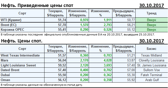 Цены спот на нефть по сортам и базисам. Данные на 30.10.2017