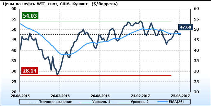 Цены на нефть сорта WTI с базиса поставки Кушинг выросли на 0.16 до 47.68 долларов за баррель. Тренд на рынке WTI медвежий. Цена на сорт MARS упала на -0.71 до 47.43 долларов за баррель.