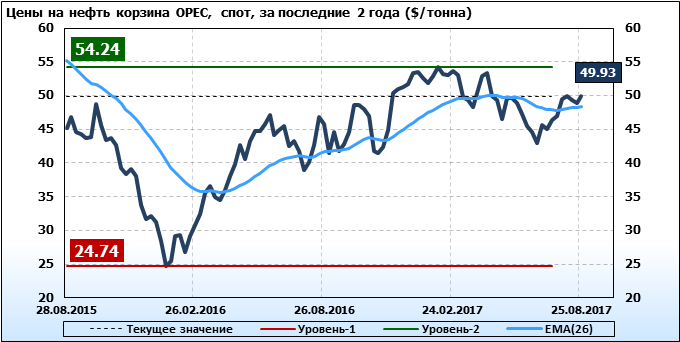 Цены на корзину сортов нефти стран членов ОПЕК выросли на 1.07 до 49.93 долларов за баррель. Ценовая тенденция по корзине ОПЕК направлена вверх. Сорт марки Dubai подорожал на 1 до 51.5 долларов за баррель.