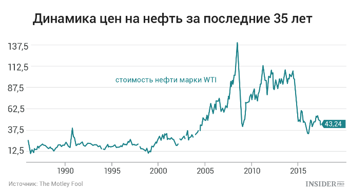 На протяжении большей части 1950-х и 1960-х нефть стоила дешевле $10 за баррель. Даже в нынешних ценах с учетом инфляции она оставалась в пределах $20−30 за баррель.