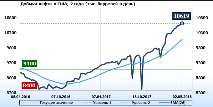Добыча нефти в США в марте 2018 г. выросла на на 0,26 млн барр/сутки или на 2,57% по сравнению с февралем 2018 г и составила 10,38 млн барр/сутки. Такие данные 10 апреля 2018 г представило Управление энергетической информации при Минэнерго США (Energy Information Administration, EIA). В марте 2018 г США перекрыли исторический рекорд месячной добычи нефти. И останавливаться на этом США не намерены. По итогам 2017 г в США добывалось 9,32 млн барр/сутки нефти. Согласно обновленному прогнозу EIA, роста нефтедобычи в США продолжится. В 2018 г США будут добывать 10,69 млн барр/сутки нефти, что превысит установленный в 1970 г исторический рекорд — 9,6 млн барр/сутки. В 2019 г добыча нефти в США поднимется до 11,44 млн барр/сутки, а в декабре 2019 США выйдут на уровень 11,6 млн барр/сутки.