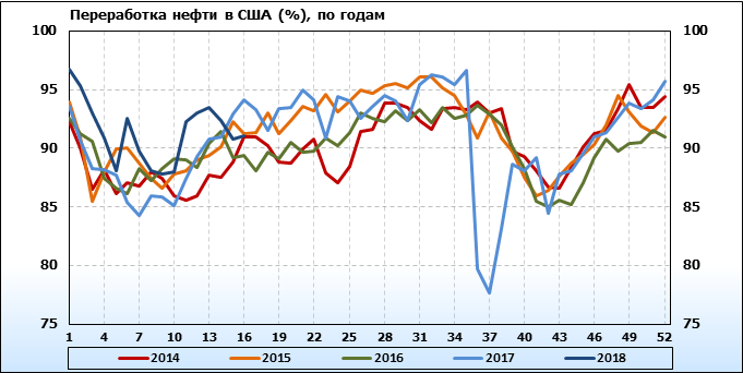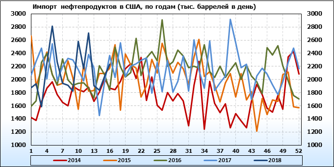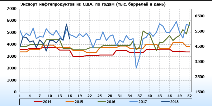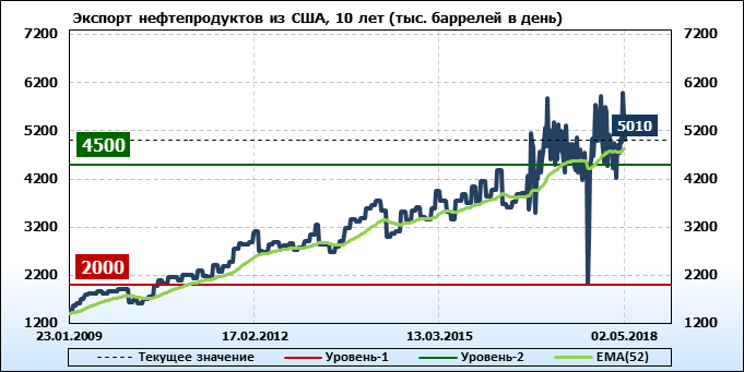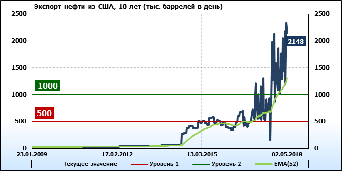 США экспортируют свою нефть, одновременно являясь ее крупнейшим мировым импортером (после Китая). Но импортировать они вынуждены в основном тяжелую нефть, а экспортировать — куда менее востребованную родными НПЗ легкую. Возможность экспорта нефти появилась после снятия ограничений в конце 2015 года. С этого времени по текущий момент экспорт вырос с 0,5 мбд до 1,6 мбд. Также существенно вырос экспорт нефтепродуктов. В последние недели впервые в истории нефть из США стала экспортироваться супертанкерами класса VLCC (их типичная загрузка очень велика — 2 млн баррелей). Если тренд на использование VLCC сохранится, стоит ждать еще большего роста экспорта нефти из США, так как транспортировка супертанкерами значительно дешевле, чем более мелкими танкерами Aframax или Suezmax, которые эксплуатируются сейчас (их использование добавляет к стоимости $0,6–0,7/барр.)