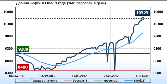 На прошлой неделе нефтедобыча в США выросла сразу на 65 тысяч баррелей в сутки, достигнув уровня 10,525 млн. баррелей в сутки. В результате прирост американского производства «черного золота» с конца ноября 2016 года составил 104% от объема сокращение нефтедобычи, предусмотренного пактом «ОПЕК+». Сегодня, 11 апреля 2018 года, Управление энергетической информации (Energy Information Administration, EIA) при американском министерстве энергетики сообщило, что за неделю 31 марта — 6 апреля объемы среднесуточной внутренней нефтедобычи в США выросли на 0,065 млн. баррелей — до 10,525 млн. баррелей (+0,62%). Напомним, на неделе 24-30 марта добыча нефти в США увеличилась на 0,027 млн. баррелей в сутки (+0,26%), на неделе 17-23 марта — на 0,026 млн. баррелей в сутки (+0,25%), а на неделе 10-16 марта — также на 0,026 млн. баррелей в сутки (+0,25%).