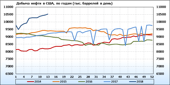 EIA также подтвердило мартовскую прогнозную оценку добычи нефти в США в 2018 году на рекордном уровне в 10,7 миллиона баррелей в сутки. После пересмотра показателей EIA сообщило, что в ноябре добыча нефти составила 10,066 миллиона баррелей в сутки. В 2019 году EIA прогнозирует добычу в США на уровне 11,4 миллиона баррелей в сутки, что выше прогноза предыдущего месяца в 11,3 миллиона баррелей. В 2017 году средний уровень добычи составил 9,3 миллиона баррелей в день. По предварительной оценке EIA, среднесуточная добыча нефти в США в марте достигла нового исторического максимума — 10,38 миллиона баррелей в сутки, что на 260 тысяч баррелей в сутки больше, чем в феврале.