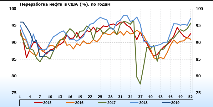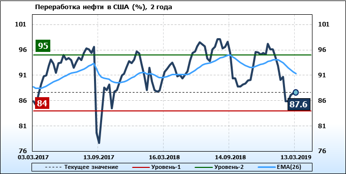 Добыча нефти упала на -0.1 до 12 млн. баррелей в день. Импорт нефти упал на -0.255 до 6.746 млн. баррелей в день. Экспорт нефти упал на -0.257 до 2.546 млн. баррелей в день. Таким образом, чистый импорт нефти вырос на 0.002 до 4.2 млн. баррелей в день. Переработка нефти выросла на 0.1 до 87.6 процента.
