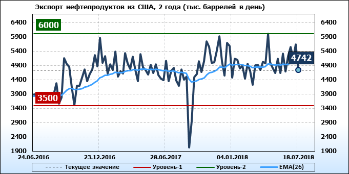 Спрос на нефтепродукты вырос на 1.394 до 21.302 млн. баррелей. Производство дистиллятов упало на -0.29 до 23.787 млн. баррелей. Импорт дистиллятов вырос на 0.162 до 2.055 млн. баррелей. Экспорт бензина упал на -0.885 до 4.742 млн. баррелей в день.