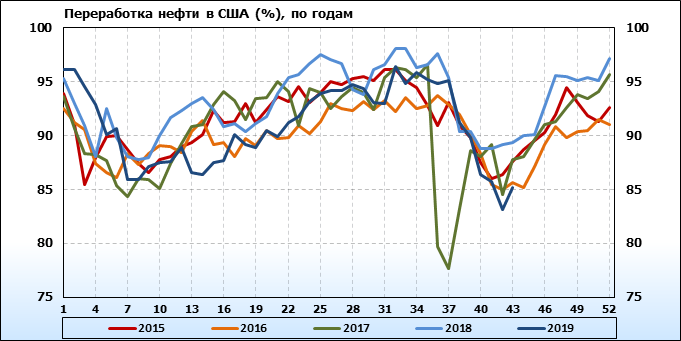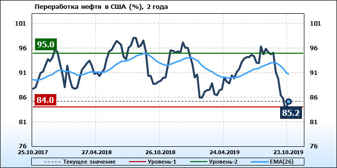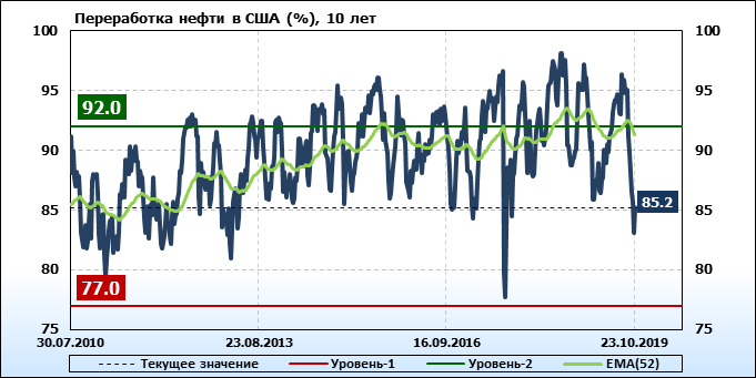 Добыча нефти не изменилась и составляет 12.6 млн. баррелей в день. Импорт нефти упал на -0.438 до 5.857 млн. баррелей в день. Экспорт нефти вырос на 0.435 до 3.683 млн. баррелей в день. Таким образом, чистый импорт нефти упал на -0.873 до 2.174 млн. баррелей в день. Переработка нефти выросла на 2.1 до 85.2 процента.