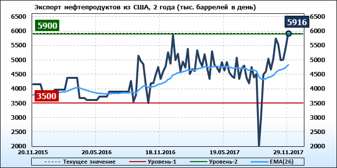 Спрос на нефтепродукты вырос на 0.375 до 19.664 млн. баррелей. Производство дистиллятов выросло на 1.047 до 23.328 млн. баррелей. Импорт дистиллятов упал на -0.151 до 1.771 млн. баррелей. Экспорт бензина вырос на 0.495 до 5.916 млн. баррелей в день.