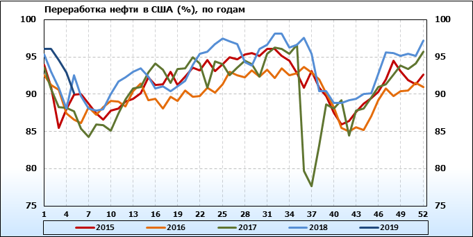 Добыча нефти не изменилась и составляет 11.9 млн. баррелей в день. Импорт нефти упал на -1.108 до 7.083 млн. баррелей в день. Экспорт нефти упал на -0.091 до 1.944 млн. баррелей в день. Таким образом, чистый импорт нефти упал на -1.017 до 5.139 млн. баррелей в день. Переработка нефти упала на -2.8 до 90.1 процента.