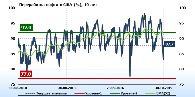Добыча нефти не изменилась и составляет 12.6 млн. баррелей в день. Импорт нефти вырос на 0.84 до 6.697 млн. баррелей в день. Экспорт нефти упал на -0.356 до 3.327 млн. баррелей в день. Таким образом, чистый импорт нефти вырос на 1.196 до 3.37 млн. баррелей в день. Переработка нефти выросла на 2.5 до 87.7 процента.