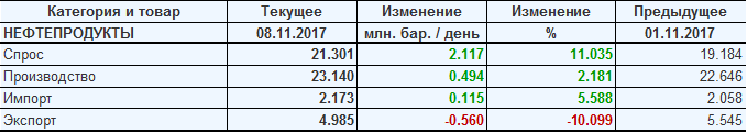 Спрос на нефтепродукты вырос на 2.117 до 21.301 млн. баррелей. Производство дистиллятов выросло на 0.494 до 23.14 млн. баррелей. Импорт дистиллятов вырос на 0.115 до 2.173 млн. баррелей. Экспорт бензина упал на -0.56 до 4.985 млн. баррелей в день.