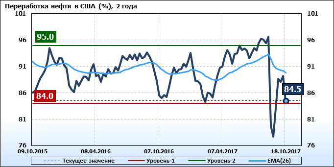 Добыча нефти упала на -1.074 до 8.406 млн. баррелей в день. Импорт нефти упал на -0.134 до 7.483 млн. баррелей в день. Экспорт нефти вырос на 0.528 до 1.798 млн. баррелей в день. Таким образом, чистый импорт нефти упал на -0.662 до 5.685 млн. баррелей в день. Переработка нефти упала на -4.7 до 84.5 процентов.