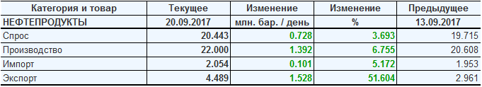 Спрос на нефтепродукты вырос на 0.728 до 20.443 млн. баррелей. Производство дистиллятов выросло на 1.392 до 22 млн. баррелей. Импорт дистиллятов вырос на 0.101 до 2.054 млн. баррелей. Экспорт бензина вырос на 1.528 до 4.489 млн. баррелей в день.